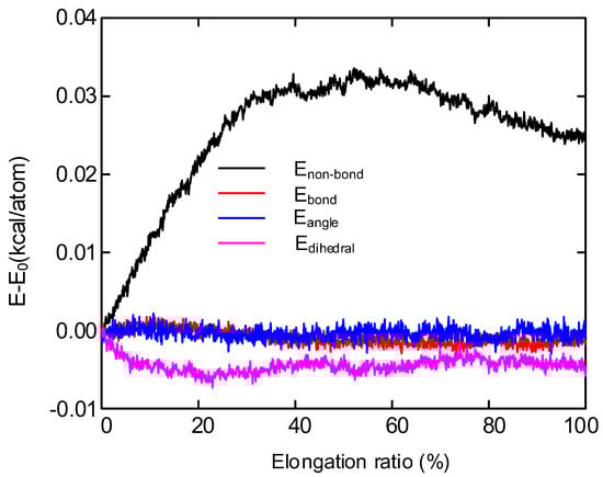 Figure 14 shows the variation of non-bond energy, bond energy, bond angle energy and dihedral energy of polyethylene during tensile process. Initially, the molecular chains are tightly pressed together. With the increase of strain, the orientation and relative movement of polyethylene molecular chains occur in the tensile process, and the free volume between adjacent molecules increases, resulting in the rapid rise of non-bond energy [42]. After reaching the yield limit, the non-bond energy is stable and increases slowly with the further increase of strain. In addition, the bond energy, bond angle energy and dihedral en-ergy of polyethylene molecules have almost no change in the tensile process.