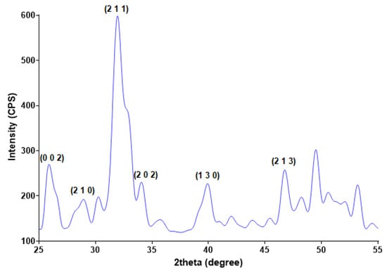 Starting from calcium and phosphorous precursors and conveniently adjusting various reaction parameters (temperature range, pH value, etc.), the hydroxyapatite (HAp) nanoparticles were obtained by the co-precipitation method [50,51]. The white powder that resulted after drying the viscous precipitate was analyzed compositional and microstructural by XRD (Figure 1) and TEM (Figure 2). The diffractogram pattern evidences the presence of broad diffraction peaks, which indicate the powder’s reduced crystallinity. Specific peaks are identified at 2θ values of 25.9°, 28.9°, 31.8°, 34°, 40°, 46.7°, and 49.5°, these maxima correspond to (0 0 2), (2 1 0), (2 1 1), (2 0 2), (1 3 0), (2 2 2), and (2 1 3) diffraction planes of hydroxyapatite crystals [52,53,54,55]. The XRD analysis confirms that hexagonal HAp represents the sole crystalline phase of the obtained powder.