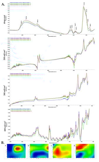 IR micrographs (B) and corresponding IR spectra (A) of HAp/CS/FGF2 coatings at (b) 200, (c) 300 and (d) 400 mJ/cm2 laser fluences and (a) drop-cast.