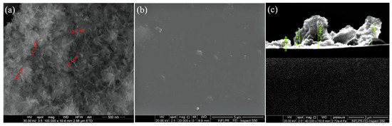 Relevant microstructural data about the obtained HAp/CS/FGF2 coatings were collected from the SEM analysis, corresponding images are presented in Figure 4 and offer information regarding the textured aspect of the coating formed at a laser fluence of 300 mJ/cm2 (Figure 4a,b). Figure 4c provides useful data concerning the thickness of the nanostructured coatings obtained at 300 mJ/cm2 laser fluence. As it can be seen, the thickness varies between 400 nm and 1 µm, which delineates the small agglomeration tendency.