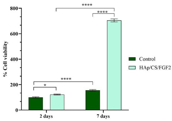 Graphical representation of MC3T3-E1 cell viability and proliferation potential after 2 days and 7 days of contact with control and HAp/CS/FGF2 samples (* p < 0.05; **** p < 0.0001).