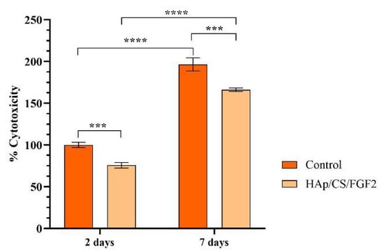 Graphical representation of LDH leakage levels from damaged MC3T3-E1 cells after 2 days and 7 days of contact with control and HAp/CS/FGF2 samples as a measure of materials cytotoxicity (*** p < 0.001; **** p < 0.0001).