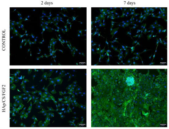 Fluorescence microscopy micrographs (scale bar 100 μm) highlighting the cytoskeleton of MC3T3-E1 cells 2 days and 7 days post-seeding on control and Hap/CS/FGF2 samples. Actin filaments were stained with phalloidin-FITC (green) and cell nuclei with DAPI (blue).