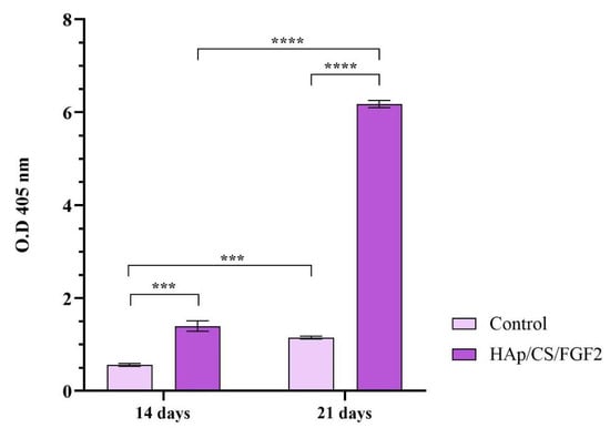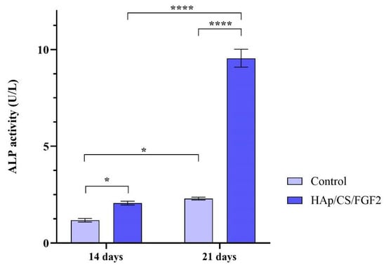 ALP activity measurement was performed after 14 and 21 days of culture to monitor the osteogenic differentiation process in the early phase as the enzyme activity increases, starting with the early stages of osteoblasts’ commitment [71]. The obtained results (Figure 8) showed that both experimental samples increased the activity of ALP over time, but a significantly higher ALP enzyme activity was observed in the media samples collected from HAp/CS/FGF2-coated samples as compared with the control samples after 14 (p < 0.05) and 21 days of culture (p < 0.0001). While in the non-coated samples, a modest increase of the ALP activity was obtained after 21 days of culture as compared with 14 days of culture, the HAp/CS/FGF2-coated samples significantly enhanced the enzyme activity. After 3 weeks of culture, the ALP activity in the HAp/CS/FGF2-coated samples significantly increased (p < 0.0001) compared to 2 weeks of culture. This 4.6-fold increment of the ALP activity between the 2 time points highlights that in contact with HAp/CS/FGF2-coated, more and more pre-osteoblasts developed into mature osteoblasts.