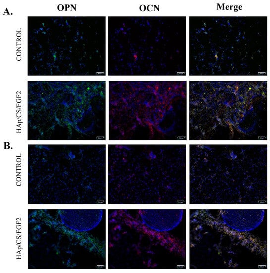 Fluorescence micrographs (scale bar 100 μm) revealing the protein expression of osteogenic specific markers OPN (green) and OCN (red) after 14 (A) and 21 (B) days of MC3T3-E1 cells’ exposure to osteogenic inductors in contact with control surfaces and HAp/CS/FGF2 coatings. Cell nuclei are stained with DAPI (blue).