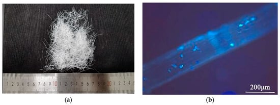 The mix ratio of OPC was calculated in accordance with the specifications for airport cement concrete pavement design (MH/T 5004-2010) []. To increase the workability and early performance of a dry and rigid concrete mixture for airport pavement concrete, P·O 42.5 cement, 4.75~16 and 16~26.5 mm double-graded gravel, and machine-made sand with a fineness modulus of 3.1 were used. F-type I low-calcium fly ash, S95-grade blast furnace slag powder, and polycarboxylic acid high performance water reducing agent were also added (fly ash replaced 16% of the cement mass, slag powder replaced 11% of the cement mass, and water reducing agent comprised 0.5% of the binding material’s total mass). The POM fiber was obtained from Chongqing Yuntianhua Tiamjuxincai Co., Ltd. (Chongqing, China); Table 2 displays its physical and mechanical properties. Figure 1 depicts the shape of POM fiber; the microscopic images were obtained using a ZEISS microscope (Carl Zeiss AG, Oberkochen, Baden-Württemberg, Germany). POM fibers were introduced to the fresh concrete at 0.6 and 1.2% of the OPC volume. After being thoroughly agitated, the fresh concrete was packed into a 100 × 100 × 400 mm beam for vibration compaction and mold testing. The four-point flexural fatigue test was performed 24 h after the product had been poured. The product was withdrawn from the mold and placed at a temperature range of 20 ± 2 °C where the relative humidity was above 95%, for standard curing over a period of 90 days. Additionally, a 100 × 100 × 100 mm cube and a beam with the same size as the fatigue specimen were created, to test the compressive and flexural strengths at 28 and 90 days. Table 3 displays the mix proportion of the specimens.