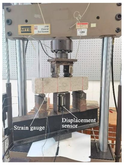 Before the test, the specimen surface was polished using a hand-held concrete grinder after being removed from the curing room. A high-pressure pneumatic sprayer was used to spray a thin layer of epoxy resin evenly on the surface of specimens, to reduce the test error produced by the unevenness of the surface. The static load strength was established prior to the fatigue test. The flexural and fatigue tests were performed using an MTS 810 test machine (MTS Systems Corporation, Eden Prairie, MN, USA), and the compression test using hydraulic pressure testing equipment with a loading rate of 18 kN/s. To produce roughly one-dimensional stress conditions in the center of the specimen, the purely flexural part of the four-point loading method was used. The specimen was loaded at a rate of 1 mm/min until damaged was observed, with loading points spaced 100 mm apart. To choose the upper and lower limits of loading that corresponded to the stress levels in the fatigue test, the failure strength was determined by taking the average value of three recordings.