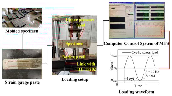 In this study, repeated loading at a frequency of 10 Hz was used, corresponding to a commercial airliner taxiing at a speed of 20 km/h on a runway [], with constant amplitude sine wave loading during the fatigue test loading to simulate the actual waveform of airport surface stress []. The cyclic characteristic value (R) of fatigue load for concrete roads, bridges, and other structures is 0.1 (the minimum fatigue loading stress is 10% of the maximum stress) []. The stress scale (S) was 0.65, 0.70, 0.75, and 0.80. Additionally, two strain gauges and a displacement sensor were placed at the bottom of each specimen, along the symmetry axis of the pure bending section. A dynamic strain tester (DH 15202, Donghua Testing Technology Co., Ltd., Jingjiang, Jiangsu, China) was attached to the test instrument. The recorded loading load, tensile strain in the pure bending region at the bottom of the beam prior to breaking, and midspan deflection deformation were simultaneously recorded during the loading procedure. To ensure that the epoxy glue on the contact surface was compacted and in complete contact with the loading point of the testing apparatus, preloading (10 kN) was repeatedly performed before the fatigue test began. Figure 2 displays a photograph of the loading setup. Figure 3 displays an experimental flowchart. Five specimens were chosen for each loading condition in the fatigue test, and the data were deleted and supplied with significant deviations to confirm the validity of the data on the fatigue life of the five specimens, as previously suggested [].