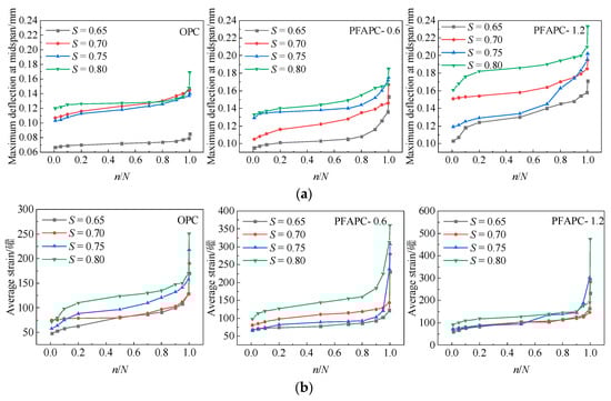 In this study, the average bottom tensile strain and maximum midspan deflection of specimens were employed to describe the fatigue deformation at various stress levels. In Figure 4, the maximum midspan deflection and average tensile strain at the bottom are shown on the ordinate; the variation curves of specimen deformation were generated on the abscissa with the cyclic ratio n/N (the ratio of current cycle times to fatigue life) based on 11 data points. The maximum midspan deflection and average tensile strain at 1, 5, 10, 20, 50, 70, 80, 90, 95, 99.5 and 100% of specimen fatigue life at each stress level represent the 11 selected data points [].