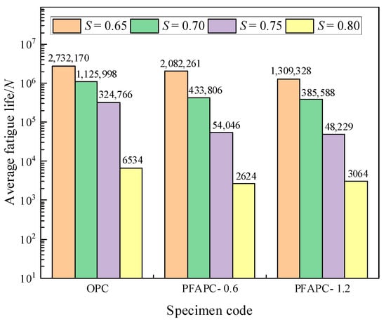 - PFAPC has a substantially shorter fatigue life than OPC, and starts to decline noticeably at increasing stress levels. At a low stress level (S = 0.65), compared with OPC, the fatigue lives of PFAPC-0.6 and PFAPC-1.2 decreased by 23.8% and 52.1%, respectively; at a higher stress level (S = 0.75), their fatigue lives decreased by 83.4% and 85.1% respectively. The fatigue life of PFAPC-1.2 was shorter than PFAPC-0.6, except at the 0.80 stress level.