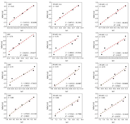 According to the information in Table 5, the ln[ln(1/p)]-lnN curves of OPC and PFAPC were developed with varying fiber contents under various stress levels, as shown in Figure 6.