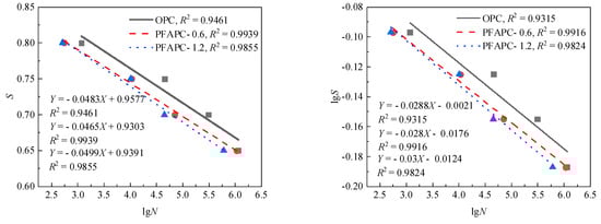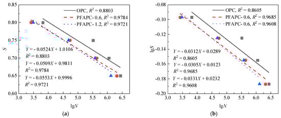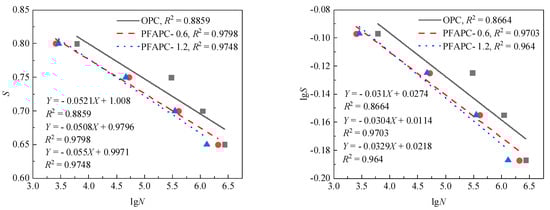 The test findings and the aforementioned boundary requirements can both be satisfied by this ideal form of the fatigue equation. S–N curves are traditionally created using the stress level S as the ordinate and the average fatigue life as the abscissa []. As illustrated in Figure 7, the standard S–N curves of OPC and PFAPC were constructed in this study using the average fatigue life in shown Figure 5.