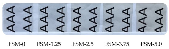 The appearance of food packaging and consumer acceptance can be affected by the color of the edible film to a certain extent, so the color of the edible film is often used as an important evaluation index of the film properties []. The transparency of the film facilitates the consumer to observe the morphology of the food contents and the changes that occur during storage. As shown in Figure 2, all films were transparent. Interestingly, the color of the films became pale yellow upon the addition of the MAAs, and the FSM-5 films showed the deepest color and the lowest brightness.