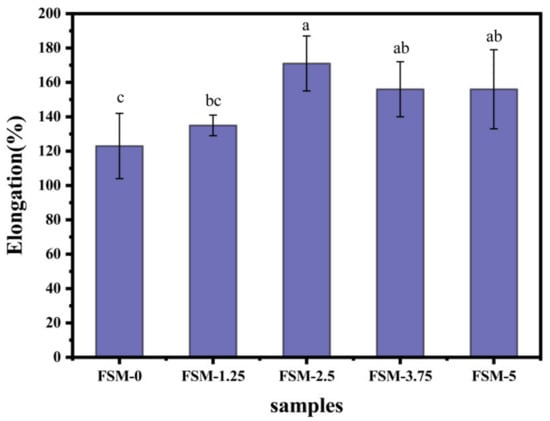 Combined with the change curve of tan δ (G″/G′) in Figure 4c, it can be seen that FSM 0 was the first to gel (in the cooling stage, tan δ = 1), and the gelling temperature was about 12 °C. It was slightly higher than the gelling temperature of the other samples, which was about 10 °C. However, in the last equilibrium stage at 10 °C, the tan δ curves of each sample overlapped. It may be that the MAAs had good fluidity and could easily be filled in the network structure of the gel. MAAs could provide a number of hydroxyl groups, which could easily form hydrogen bonds with FG molecules and SA molecules. Generally, more intermolecular interactions contributed to the increase in the density of physically cross-linked points, which slightly extended the film-forming time. Moreover, the addition of the MAAs can improve the mechanical properties of the prepared composite films, which is consistent with the measurement results of the tensile properties.