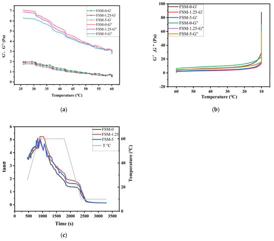 The gelation processes of the film samples were characterized by a rheometer (Haake Mars 3, Thermofisher, Hennigsdorf, Germany) with a rotor (P35TiL) and diameter parallel plate measurement system (diameter: 35 mm, gap 1 mm, shear frequency: 1 Hz, strain: 0.1%). In brief, FSM-0, FSM-1.25 and FSM-5.0 composite solutions (2 mL) were pipetted onto the plate of the instrument. Then, the edge of the geometry was covered with a layer of silicone oil. The temperature increased from 20 °C to 60 °C at a heating rate of 5 °C/min, equilibrated for 15 min, lowered to 10 °C at a rate of 5 °C/min and then equilibrated for another 15 min. The changes in G′, G” and tan δ (G”/G′) were recorded during the whole process [].