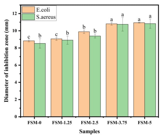 The composite films have antibacterial power to minimize bacterial growth on food or drug surfaces. Figure 6 shows the antibacterial activity of the composite films against E. coli and S. aureus. With the increase in MAA content, the area of the inhibition zones increased. In addition, the area of the inhibition zones against E. coli and S. aureus increased from 8.83 mm and 8.53 mm to 10.94 mm and 10.83 mm, respectively. Overall, the ability of the composite films against E. coli was better than the inhibition of S. aureus, which may be related to the differences in the cell structure and chemical composition between these two bacteria []. As small molecule substances, MAAs were more likely to diffuse on the surface of the bacterial films to achieve an antibacterial effect.