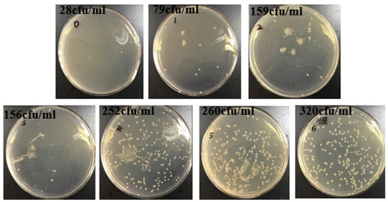 Furthermore, the ultraviolet resistance of the composite film was demonstrated by bacterial studies. As shown in Figure 8, the plates without the film were exposed to ultraviolet radiation irradiated for 15 min. The E. coli colonies were smaller and extremely sparse. On the other hand, the E. coli colonies were dense and well-developed on the plates without UV irradiation. Interestingly, when the MAA concentrations were low (less than 2.5%), the E. coli colonies were small and uneven. However, as demonstrated in plates 4 and 5 in Figure 8, when the concentrations of the MAAs were increased to 3.75% and above, the number of colonies grew dramatically, and the E. coli growth was comparable to that of the non-UV irradiation group.