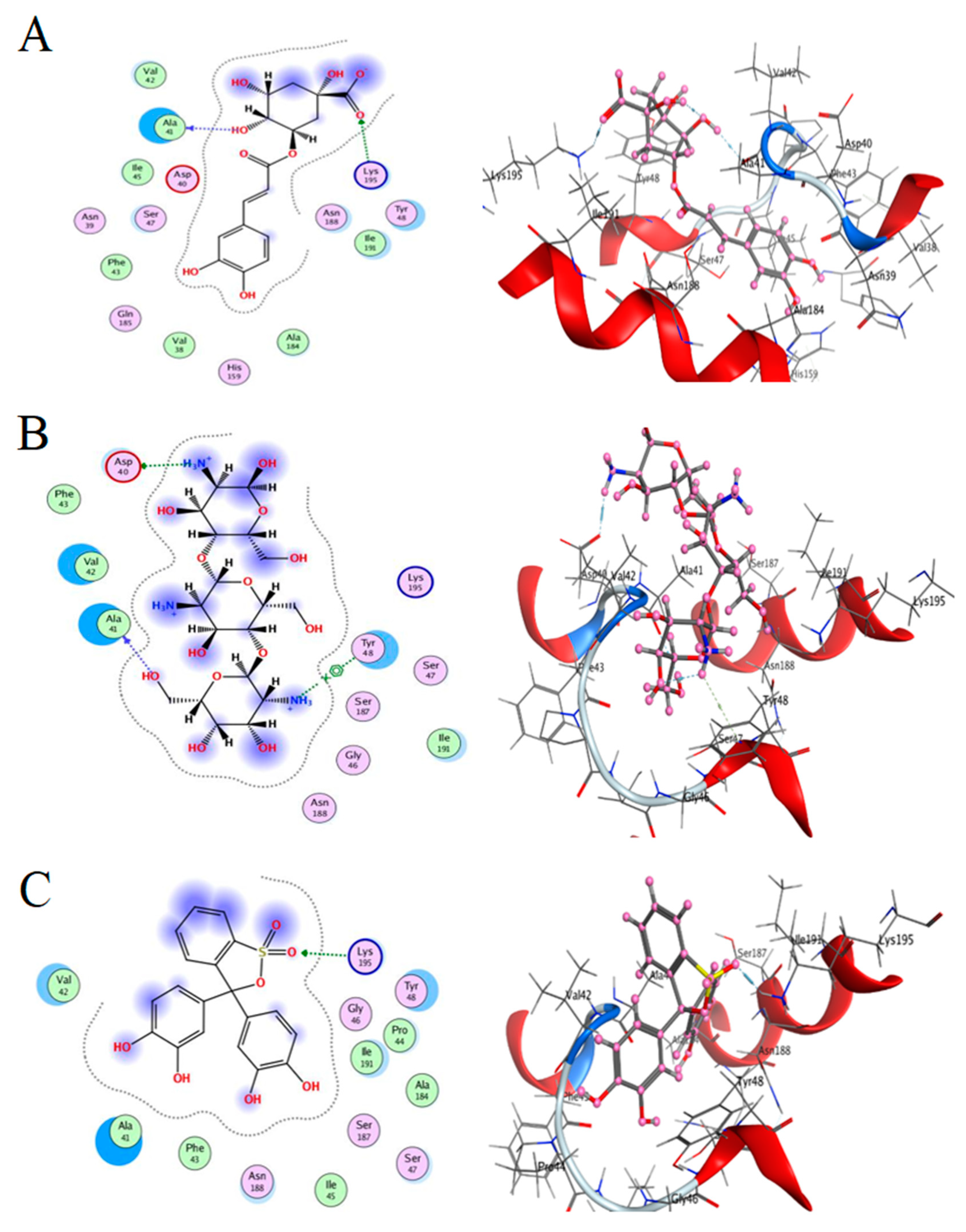 | Chlorogenic acid | ![]() | −6.2138 | 2.1646 | −4.0346 | −85.5775 | −13.3926 | −31.8557 | −6.2138 |