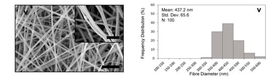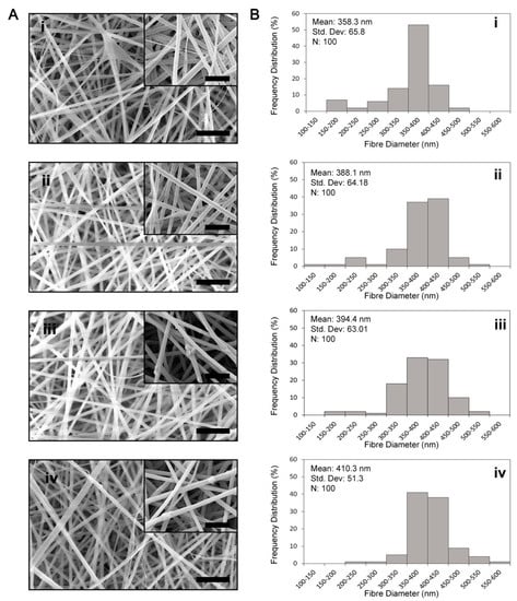 The SEM images revealed that electrospun SF fibres have smooth, uniform surfaces (Figure 1A-i), and even at high magnification, irregularities, or fractures in the fibre surfaces, were not evident (Supplementary Figure S1C). In contrast, scaffolds containing 1 wt% and 3 wt% HNTs had intermittent irregularities at high magnification, while scaffolds containing 5 wt% and 7 wt% HNTs had more frequent irregularities. Often these irregularities appeared as a swelling or a lump in the SF fibre (Supplementary Figure S1A-i,A-ii), while in other places, it appeared that aggregated nanotubes were protruding from the side of SF fibres (Figure 1A-iv,A-v and Figure S1B-i). With increasing HNT content, there was a noticeable increase in the number of fibres with very rough, irregular, fractured surfaces. This was particularly apparent when the HNT content was 7 wt% (Supplementary Figure S1B). Including HNTs at any concentration increased fibre diameters (Figure 1B-i–B-v).