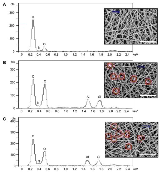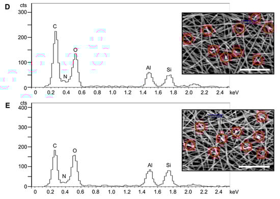 The EDS spectra indicated that SF has a chemical composition of carbon, oxygen, and nitrogen (Figure 2A). The general chemical formula for halloysite clay is (Al2Si2O5(OH)4.nH2O), and the presence of aluminium and silicon elemental peaks in the SF solution prior to electrospinning was detected upon the addition of HNTs (Figure 2B–E). The SEM images (Figure 2 inserts) revealed that HNTs became incorporated into the SF fibres after electrospinning the SF/HNT solutions previously shown to have aluminium and silicon elemental peaks.