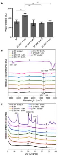 Characteristics of the scaffolds. (A) Water uptake capacity of SF scaffolds and SF/HNT composite scaffolds. All tests were performed on 5 replicates. Means ± SD are shown. Statistical analyses were ANOVA followed by Tukey’s test. * p ≤ 0.05, ** p ≤ 0.01. (B) FTIR spectra of as-spun SF scaffolds, methanol-treated SF scaffolds, and SF/HNT composite scaffolds. (C) XRD pattern of SF/HNT composite scaffolds and as-received HNTs.