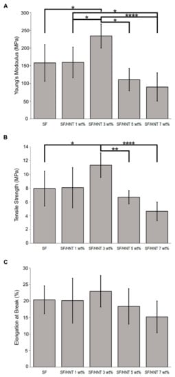 Mechanical properties of SF and SF/HNT composite scaffolds. (A) Young’s modulus, (B) tensile strength, and (C) elongation at break of SF. The analyses were performed on 10 replicates for each batch of scaffolds. Means ± SD are shown. Statistical analyses were ANOVA followed by Tukey’s test. * p ≤ 0.05, ** p ≤ 0.01, **** p ≤ 0.0001. Elongation at break data was not significantly different.