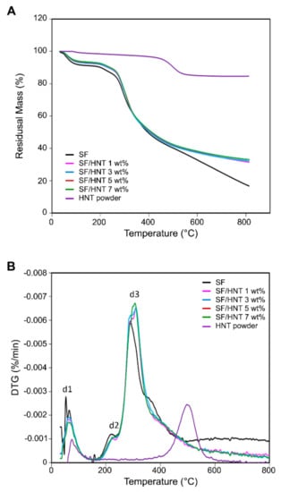Derivative thermogravimetric (DTG) curves (Figure 5B) reveal three distinct temperature peaks, Td1, Td2, and Td3. For SF scaffolds, the Td1 peak at 68.22 °C is probably due to moisture loss, while the Td3 peak detected at 291.32 °C is more likely due to SF decomposition (Table 3). With the addition of HNTs, both Td2 and Td3 increased, reaching their maximum value for composite scaffolds containing 3 wt% HNTs, while for Td1, the maximum value was achieved for SF/HNT 1 wt% scaffolds. Similar to the TGA values, all three decomposition temperature peaks decreased as the HNT content in the composite scaffolds increased to 7 wt%, although their Td3 was still greater than that of SF.