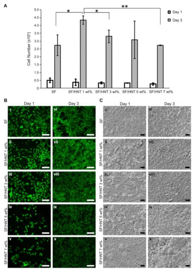 Representative FE-SEM micrographs of 3T3 cells on SF and SF/HNT composite scaffolds after 1 and 3 days of culture confirmed that all scaffolds provided an environment that supported cell attachment (Figure 6C). The cell shape on all scaffolds except SF/HNT 7 wt% scaffolds indicated adhesion and spreading had occurred by day 1. The cells on SF/HNT 7 wt% composites were round and not spread (Figure 6C-v). After 3 days of culture, the cell layers virtually covered the scaffold surface, except for small areas between the expanding cell colonies, but on SF/HNT 1 wt% composite scaffolds, the areas not occupied by cells appeared smaller than those on the other scaffolds (Figure 6C-vii). These data are consistent with the cell proliferation results (Figure 6A) and the confocal microscopy images (Figure 6B).