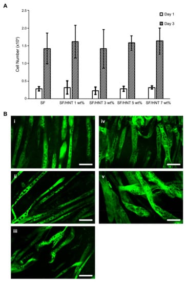 To determine whether HNTs in SF scaffolds affected cell behaviour, the growth of 3T3 fibroblasts on the scaffolds was assessed using a CellTiter Blue assay. On all scaffolds, cell number increased with increasing time in culture. Cell numbers on the scaffolds on day 1 were similar, but on day 3, significantly more cells were recorded on SF/HNT 1 wt% composite scaffolds than on SF scaffolds (Figure 6A). Visualisation of the cells on the scaffolds after staining with Alexa Fluor 488 conjugated phalloidin indicated SF/HNT 1 wt% composite scaffolds best supported 3T3 cell growth at day 3 (Figure 6B). Although slightly fewer cells were visible on composite scaffolds containing 5 and 7 wt% HNTs, these cells were evenly distributed over the scaffolds, suggesting uniformity in the surface characteristics across the scaffolds. Day 1 images revealed the cell shape differed on the various scaffolds. Many cells on SF scaffolds and SF/HNT 1 wt% scaffolds were elongated and had long projections, indicating cell spreading (Figure 6B-i–B-ii). The cell shape changed as the HNT content increased, cells lost their elongated shape, and cells on scaffolds with the highest HNT content were almost spherical (Figure 6B-iii–B-v).