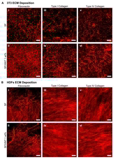 Accordingly, 3T3 fibroblasts were seeded on SF scaffolds and SF/HNT 1 wt% composite scaffolds and cultured for 7 days, then decellularised. Immunofluorescence staining of the scaffolds revealed fibronectin, collagen I, and collagen IV were deposited by the 3T3 cells on both scaffold types (Figure 8A-i–A-vi). Still, ECM protein deposition was greater on SF/HNT 1 wt% scaffolds compared to that on the SF scaffolds. Immunofluorescence staining of primary HDFs grown on SF and SF/HNT 1 wt% composite scaffolds revealed fibronectin, collagen I, and collagen IV deposition on both scaffold types (Figure 8B-i–B-vi). The pattern and intensity of fibronectin staining were similar on the two scaffolds, and in neither case was fibronectin evenly distributed across the scaffold (Figure 8B-i,B-ii). In contrast, collagen I and collagen IV were deposited as dense, well-organised, aligned fibres (Figure 8B-iii–B-vi) that covered the scaffold surfaces. Thus, both 3T3 cells and HDFs deposit substantial ECMs on either SF or SF/HNT 1 wt% composite scaffolds, and the most pronounced differences were between the appearances of the ECMs deposited by the two cell types.