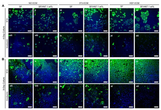 Given the above results, keratinocytes were grown for 4 days on SF and with and without a decellularised fibroblast-derived ECM coating, and the cultures were stained with an anti-K14 antibody to indicate the basal keratinocytes (Figure 9A-i–A-vi). Keratinocytes behaved differently on each scaffold. On SF and SF/HNT 1 wt% composite scaffolds, keratinocytes grew as single cells, whereas on scaffolds coated with either 3T3 cell- or HDF-derived ECM, they grew as colonies. Keratinocyte terminal differentiation was examined by staining cultures with antibodies recognising the differentiation markers, K10 and involucrin. No K10 staining was detected in cells on any of the scaffolds (data not shown), whereas the scaffolds differently triggered involucrin expression. Scaffolds coated with HDF-derived ECM had very few keratinocytes that expressed involucrin, whereas these numbers were higher on uncoated scaffolds or scaffolds coated with 3T3 cell-derived ECM (Figure 9A-vii–A-xii).