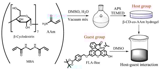 The hydrogel sensors were prepared and synthesized by guest–host interaction as shown in Figure 1. At first, Acrylamide (AAm), β-cyclodextrin (β-CD) and N,N′-methylene bisacrylamide (MBA) (0.3% of monomer content) were mingled together and dissolved in DMSO solution. Then the mixture was stirred under a vacuum at 5 °C until a homogeneous solution was formed. In the next step, 100 μL of TEMED and initiator (APS, 2% of monomer content) were put into the mixture. The mixture was stirred constantly until a homogeneous solution was witnessed during the reaction, which was subsequently poured into a cylindrical mold and maintained at 50 °C for 12 h. In the following step, the hydrogel was extracted and collected from the mold and then rinsed with DMSO for 36 h. AAm-co-β-CD hydrogel was steeped in 10−2 mol/L of FLA-Boe DMSO solution for 10 h before being dialyzed in H2O for 2 h to fabricate the hydrogel sensor in accordance with the host–guest interaction.