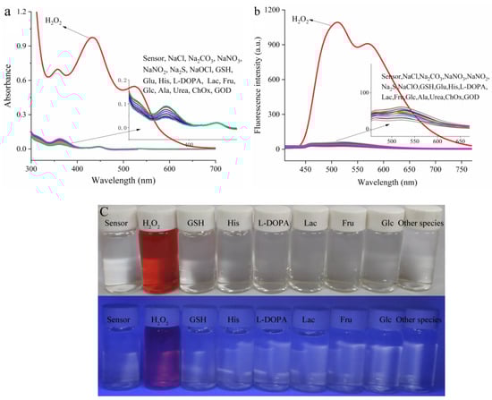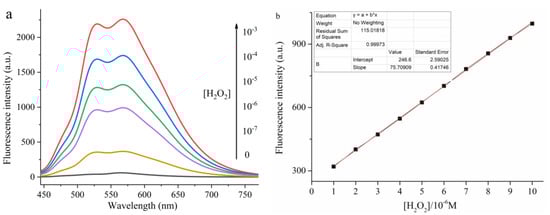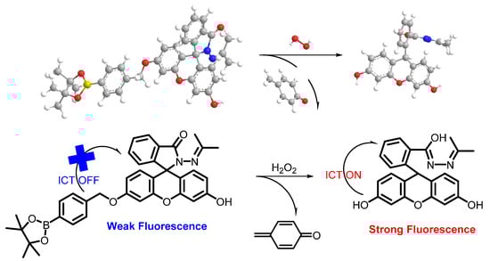 Hydrogen peroxide (H2O2), a typical reactive oxygen species (ROS), functions as a key throughout cell growth, proliferation, host defense, and signal transmission pathways under a physiological environment [,]. However, the chemical and pharmaceutical industries inevitably use hydrogen peroxide as an oxidizer for related production activities, resulting in the discharge of excessive hydrogen peroxide in wastewater, which severely impacts people’s living environment and the water treatment system []. Excessive H2O2 in the human body triggers the pathogenesis of many disorders, such as inflammation, Alzheimer’s disease, cardiovascular disease and, more seriously, cancer []. Consequently, it is vital to monitor H2O2 in the inner condition and outer environment of the human body []. Undoubtedly, the development of H2O2 fluorescent sensors has been arousing people’s interest. Thus, the design and fabrication of sensing systems with H2O2 responsive characteristics are key for human health and environmental protection.