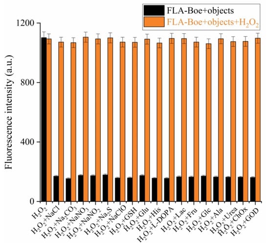 The fluorescence intensity contrast bars in order to investigate the interference effect of other test objects on the detection ability of FLA-Boe for H2O2.