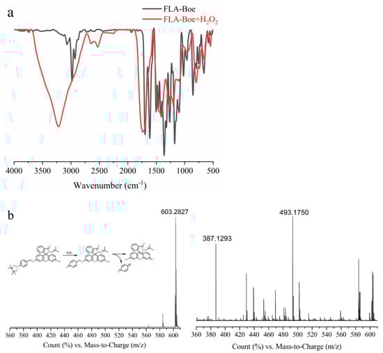 (a) FT-IR of FLA-Boe and FLA-Boe−H2O2, (b) HRMS of FLA-Boe and FLA-Boe−H2O2.