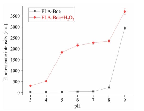The influence and phenomenon of the probe FLA-Boe to H2O2 were analyzed in different pH conditions. As shown in Figure 6, within the scale of pH 3.0–4.0, the probe failed to respond notably to H2O2. While FLA-Boe was exposed to H2O2 within the scope of pH 5.0–8.0, the decomposition of the boronate ester group was taken, then the ICT process of Fluorescein was recovered, through which the strong fluorescence emission from Fluorescein was triggered. As a result, the FLA-Boe could respond efficiently to H2O2 in the pH range of 5.0–8.0. The fluorescence intensity reached 581 nm and the response of the probe to H2O2 gradually receded after the pH value was improved to 8.0–9.0. Thus, the phenomenon illustrated that the probe FLA-Boe had eminent fluorescent responses to H2O2 from weakly acidic to weakly alkaline conditions.