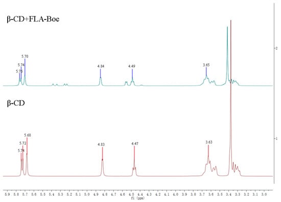 The work noted that the formation of the β-CD-FLA-Boe inclusion complex was distinctly performed by 1H NMR; meanwhile, the inclusion procedure was demonstrated preliminarily. The 1H NMR spectrum of β-CD during the appearance and disappearance of FLA-Boe was shown in Figure 7. The integral signal strengths in the 1H NMR spectrum were investigated. The inclusion of β-CD with FLA-Boe exhibited small changes, and a conspicuous influence was shown on the chemical shifts of protons of β-CD-FLA-Boe, which varied notably (Table 1), revealing that these protons primarily contributed to the inclusion with FLA-Boe. More supporting evidence regarding the inclusion of FLA-Boe in the central cavity of β-CD was acquired from 1H NMR studies. In comparisons of the free β-CD and FLA-Boe, the chemical shifts of the inclusion complexes were investigated, demonstrating that FLA-Boe had mutually interacted with β-CD.