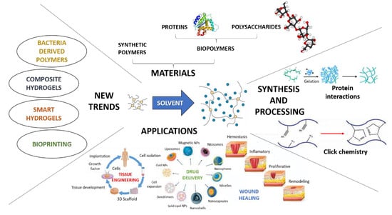In addition to biomedical applications, hydrogels are also very appealing for many applications, such as self-assembly and catalysis, among others []. However, in this review article, the goal was to contextualize the current situation and challenges for hydrogel engineering for biomedical applications, as well as to compile the current trends in this field, with the premise that novel hydrogels with stronger and more stable properties are still needed and remain an important direction for research []. As was previously mentioned for TE, due to their properties and their ability to mimic ECM properties, hydrogels are suitable candidates for many biomedical applications, such as controlled drug release and wound healing, which are among the most well-known possible applications where hydrogels are posed as a promising solution [,,,]. Therefore, the objective of this review was to update and summarize current trends in applications and advances in hydrogel science, by means of the most used materials and synthesis methods for hydrogel manufacture, as well as different strengthening strategies, such as compositional modifications, different cross-linking techniques and hybridization. An overview of this purpose is depicted in Figure 1.