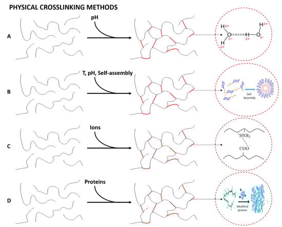 When the liquid phase changes to a gel due to an environmental change (pH, temperature, mixing of two components or ionic concentration) the hydrogels formed are known as physical hydrogels []. Their main interest lies in the absence of cross-linking agents in the synthesis. Figure 4 shows schematically the formation of physically cross-linked networks, specifying the interaction that constitutes the mentioned structures for each of the four types of cross-links that generate physical hydrogels, as depicted in Figure 3 [].