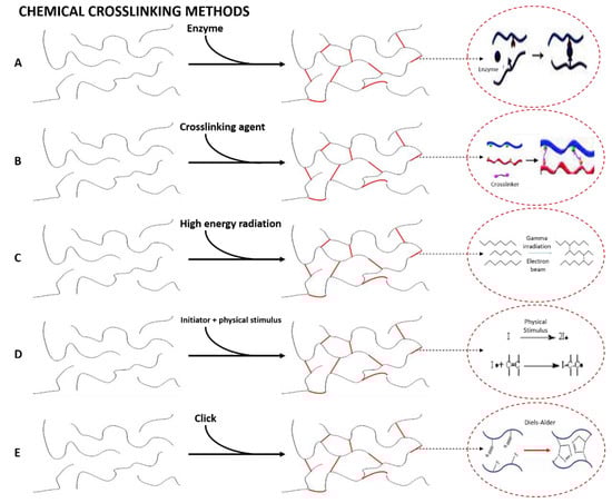 Formation of chemically cross-linked hydrogels by (A) enzymatic reactions, (B) chemical reaction promoted by a cross-linking agent, (C) high-energy radiation, (D) free-radical polymerization and (E) click reactions.