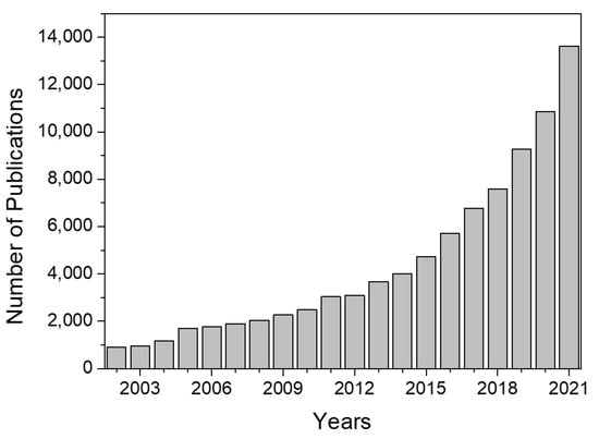 The research field of hydrogels is evolving and gaining recognition over the years. Figure 6 shows the evolution of the number of publications concerning hydrogels since 2002. As can be observed, the evolution follows an exponential trend, especially from 2018.