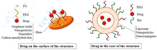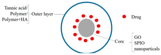 PLGA is an attractive option in drug delivery due to its biodegradable and biocompatible nature []. A generalized structure of the PLGA-based nanohybrids is given in Figure 4. Folic acid-functionalized andSPION (superparamagnetic iron oxide nanoparticles)/doxorubicin-loaded polymeric (poly(lactic-co–glycolic acid)) gold porous shell nanohybrids DOXO/SPION-PLGA NPs (DXSP-PGNH) were prepared for multifunctional use (for photothermal therapy, NIR-triggered drug release, magnetic- and folic-acid-targeted drug delivery, and MR imaging). These NHs were then tested for their potential in cancer theranostics on the HeLa cell line. The polymeric nanohybrids exhibited NIR-based drug release and induced localized cell death. The nanohybrids exhibited improved MRI properties and the FA receptor-based NPs (DXSP-PGNH-FA) showed a specific targeting of the cancer cells. The nanohybrids could be guided to tumors by magnet-assisted targeting. The high likelihood of cell death also increased in the case of the loaded nanohybrids supplied with the NIR, and it was better than the free DOXO []. Ray et al. intercalated MTX (methoteraxate) with Mg-Al-LDH (layered double hydroxide) and PLGA (poly (lactic-co-glycolic acid))-coated nanohybrids and tested their potential against osteosarcoma (MG-63 cell line). The nanohybrids produced significant anticancer activity in the in vitro studies, although the activity of the NHs was less than that of the MTX, and with the increase in the incubation time, the activity of the NHs became better than the NHs. In comparison to bare MTX, the NHs showed a longer retention in the in vivo studies on the New Zealand White rabbit model []. Jain et al. prepared NHs containing PLGA nanoparticles functionalized with HA (hyaluronic acid) and loaded with NIC (niclosamide). The ((NIC-PLGA NP)HA) NHs were highly cytocompatible and produced better cytotoxicity on the MDA-MB-231 than on the L929 cells, thus determining its cancer-targeting capabilities. Further in vivo studies are necessary to understand and estimate the possibilities of their use in therapeutics [].