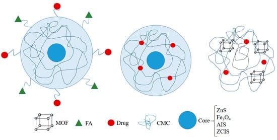 CMC is a cellulose derivative and has good biodegradability, biocompatibility, low cytotoxicity, and cell adhesion properties. CMC materials are widely used in drug delivery due to their high stability, reliability, pH sensitivity, drug binding capacity, long half-life, and biocompatibility [,,,]. Mansur et al. prepared quantum dot–biopolymer–drug nanohybrids and performedin vitro studies for their anticancer drug delivery and glioblastoma-targeting capability. ZnS fluorescent-QDs, carboxymethyl cellulose (CMC), and doxorubicin (DOX) formed ZnS@CMC-DOX nanohybrids. The blank nanohybrids did not produce any cytotoxicity in the healthy as well as glioblastoma cells. Free DOX showed more accumulated release percentage in an acidic environment than in a neutral one, whereas the NHs produced a similar accumulated drug release percentage in both the acidic (pH5.5) as well as the neutral pH (pH7.2). Drug-loaded nanohybrids produced a significant decrease in cell viability on prolonged exposure, but free DOX produced better activity than the NHs in the same exposure time []. Leonel et al.prepared magnetic (iron oxide) Fe3O4, MION, and cobalt-doped (CoxFe3−xO4, Co-MION) nanoparticles functionalized with CMC (carboxymethyl cellulose) core–shell nanohybrids and tested them for anticancer activity on HEK 293T and U87 cells. The magnetic nanohybrids (MION-CMC) acted as nanoheaters and killed U87 (glioblastoma) cells by hyperthermia under the influence of an alternating magnetic field at higher concentrations. However, further studies could help to understand the effect of these NHs on the biological system []. Carboxymethylcellulose-coated nanohybrids CMC/5-FU@MOF-5 were prepared by encapsulating the drug 5-FU (fluorouracil) in zinc-based MOF-5 (metal-organic framework), and then pH-sensitive CMC (carboxymethyl cellulose) was used as a protective polymer. The drug showed a sustained release in the GIT conditions in the in vitro studies. Along with that, the NHs produced some amount of toxicity against the HeLa cell line. Though, further modification in the formulation could improve the cytotoxic activity of the NHs []. Carvalho IC and group in 2019 prepared Poly-L-arginine and L-cysteine-functionalized CMC (carboxymethyl cellulose) conjugates (CMCelPolyArg and CMCelCys) and then capped them onto fluorescent AgInS2 QDs (AIS-QDs). The final nanohybrids (AIS-CMCel_Cys and AIS-CMCel_PolyArg) showed no cytotoxic effects in the in vitro studies on U-87 MG and HEK 293T cells. Both the NHs were successfully internalized by the U-87 MG and HEK 293T cells; however, a higher internalization was exhibited in the U-87 MG. The NHs were very biocompatible, as they were nontoxic and were effectively internalized in both the cell lines, but their effectiveness in brain cancer remained unexplored []. However, Carvalho IC and group in 2021 prepared a similar type of nanohybrid structure with some modifications in the NHs consisting of KLA (mitochondria-targeting peptide)-conjugated CMC_Cys (cysteine-modifiedcarboxymethylcellulose) with fluorescent AgInS2 and AIS (semiconducting core) for targeting glioblastoma (U-87 MG) cells. The NHs with CMC_Cys-KLA produced 70 times better activity than the NHs with just CMC_Cys and were more cytotoxic to the U8–7 MG cells. These nanohybrids were more lethal than DOX and they also produced a protective effect on the healthy cells. Although these NHs were good at killing glioblastoma cells, more studies could determine their reliability for cancer treatment []. Mansur et al. synthesized CMC (carboxymethyl cellulose)-functionalized Cu-In-S/ZnS and Cu-In-S QDs (ZCIS@CMC) and (CIS@CMC). FA (folic acid) was further conjugated along with the DOX onto these NHs to form ZCIS@CMC-FA-DOX. The NHs were found to be fluorescent and were tested for their anticancer potential on TNBC (FRα+), MCF7 (FRα−), and HEK 293T cells. The unloaded NHs were nontoxic, making them highly biocompatible; however, the loaded NHs produced better activity than the DOX on TNBC (triple-negative breast cancer), whereas it was less active on HEK 293T and MCF-7 cells, representing the specific targeting of the NHs. More studies on the nanostructures could open new gateways for the modification and exploitation for cancer therapy []. DOX (doxorubicin)-conjugated bifunctional magnetopolymersomes (MION@CMC-DOX) were prepared, and they consisted of CMC (carboxymethylcellulose) and MION (iron oxide nanoparticles). The in vitro cytotoxic study was done on U87 and HEK 239T cells. For comparison, theloaded NHs (MION@CMC-DOX) produced cytotoxic activity, whereas the unloaded MION@CMC had a low toxicity. Although, in the presence of an alternating magnetic field, the hyperthermic effect killed the cancer cells, even in the presence of an alternating magnetic field the loaded NHs (MION@CMC-DOX) were more lethal than the MION@CMCs. Though the NHs successfully killed glioblastoma cells, more modification and studies could make them an excellent agent for cancer therapy []. The generalized structures of the CMC-based nanohybrids are given in Figure 2.