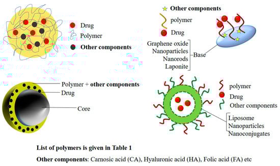 Nanotechnology enables the manipulation of matter at the nanoscale, especially matter from the1 to 100 nm scale, and the 21st century has seen an emergence of nanotechnology []. Nanotechnology has led to the molecular age of medicine, and it is advantageous, as most of the subcellular structures are on the nanoscale, e.g.,the width of the cell membrane (6–10 nm), the dimensions of proteins (1–20 nm), and the width of DNA (approx. 2.5 nm). Nanotechnology has proved to be very effective in cancer drug delivery, as the nanocarriers protect the drug from degradation and help to supply the drug in therapeutic concentrationswhilealso avoiding drug delivery to normal cells [,]. As nanotechnology uses various nanoparticles (nanocarriers) as building blocks, the properties of these nanoparticles make it possible to exploit their use in drug delivery [], and these nanoparticles can be used to make different nanoformulations, nanocapsules, and nanoemulsions []. The presence of multiple components in a nanoformulation leads to the formation of nanohybrids (NHs), and these NHs contain a variety of components in them, from nanoparticles to polymers to the targeting agent. Furthermore, these nanohybrids can overcome the drawbacks of conventional drug delivery and work synergistically to produce better activity [,,]. They have also proved their effectiveness in gene therapy for cancer, and they can deliver a variety of genetic material, such asimmune activators, microRNA inhibitors, smallinterfering RNA, and plasmid DNA []. The nanohybrids, being very small particles, exhibit deep tumor penetration, and because they contain multiple components, they can be customized for specific cancers. They have also found their way into photodynamic therapy because they exhibit excellent photodynamic properties and can be triggered by external stimuli such asphotosensitization [,]. The interest in using polymers in nanoformulations is also growing, and its effectiveness is dependent on the properties of the polymer as well as its nanostructure []. Polymers provide the controllable release of the drug and adjustability in the release rate for hydrophobic and hydrophilic drugs []. We have presented the recent uses of polymers in the preparation of nanohybrids for cancer therapy in this review.