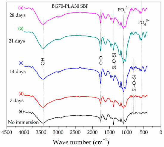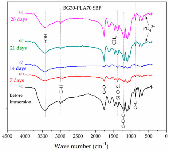 The silanol groups at 3500 cm−1 are present in the FTIR spectrum of the BG30-PLA70 sample in SBF (Figure 4). Due to the higher composition of PLA in the composite, the presence of stretching vibrations of C-C, C-O-C, and C=O bonds are observed, and are associated with the crystallinity of the PLA phase. The bending and stretching vibrations of Si-O-Si bonds correspond to the BG phase. At 21 and 28 days of immersion, the formation of the Hap phase was observed in the vibrational bands with low intensity at 573 cm−1 and 610 cm−1, which are related to the bending vibrations of the phosphate () groups. Chen et al. [23] observed the vibrational bands at 608 and 561 cm−1 to be associated with the strengthened intermolecular interaction of the molecules in the crystal lattice in highly-ordered arrangements. Thus, it is possible that the phosphate formation acts as a molecular link. The BG dissolution mechanism in the biological fluids was associated with ions leaching from BG into PBS, followed by decomposition of silica–oxygen bonds of the BG network and redeposition of the calcium and phosphorus ions onto the biomaterial surface [24].