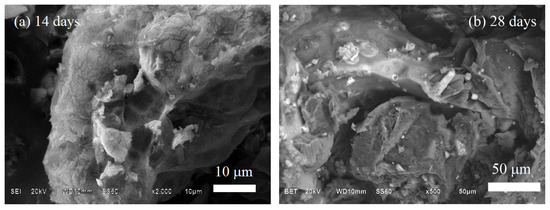 Scaffold SEM analysis for BG70-PLA30 after (a) 14 days and (b) 28 days of immersion in PBS.