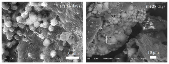 The morphology of the BG70-PLA30 composite after 14 and 28 days immersed in PBS is shown in Figure 11. After 28 days of immersion the surface sample showed more dissolution than at 14 days. The highest mass dissolution occurred at 28 days, diminishing the formation of reaction products deposited on the composite surface (Figure 11b). The sample’s surface did not show higher product growth than the sample immersed for 14 days (Figure 11a). Additionally, the results of EDS analysis in both time periods confirm the degradation behaviour when comparing the elements presented in the samples after 14 and 28 days of soaking in PBS (Table 6). The carbon, sodium, and chloride elements in the initial sample were degraded into the solution after 28 days of immersion, as noted in Table 6. Similarly, the morphology of the degradation of the BG30-PLA70 scaffolds can be observed in Figure 12 after 14 and 28 days of immersion. The formation of spherical growths formed by the HAp phase and the presence of calcium in a high concentration confirms this. For this composite, the results of the EDS chemical analyses shown in Table 5 after 14 and 28 days of immersion present the peak bioactivity of the prepared scaffolds. The increase in Ca content is more evident in the samples with longer immersion times.