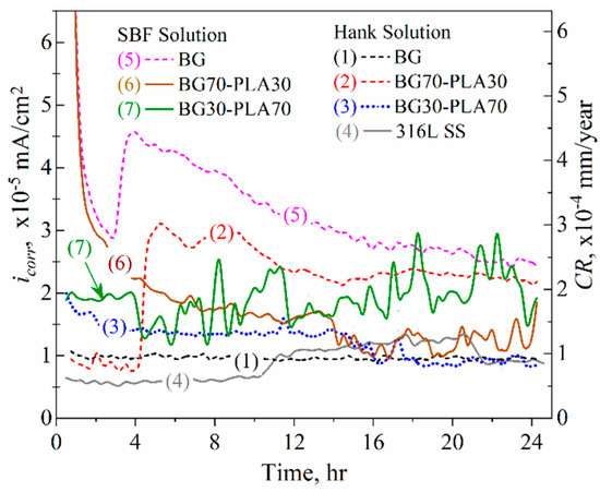 The estimation of the corrosion rate (CR), as described in the ASTM G102 [15] using the icorr kinetics (Figure 16 right scale), is valid for the data obtained by the substrate, presenting a CR between 0.06 to 0.12 µm/year. These lower CR values are a consequence of the chromium oxide protective film formed previously on the self-protected 316L SS alloy. The application of the hybrid coatings did not lead to an increase in corrosion resistance. However, this was not the main purpose of coating the metallic substrate with the BG-PLA biomaterials; rather, it was to improve their functionality due to their high bioactivity, osteoconductivity, and biodegradability for potential applications and physiological functionality as implantable devices. Therefore, the kinetics of the hybrid coatings showed CR values as low as the substrate and in the same order of magnitude. In general, the kinetics showed stability of current density and CR at around 1 to 2 µm/year during the immersion time, with the exception of the BG coating in SBF solution and the BG70-PLA30 in Hank’s solution.