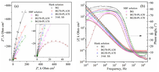 EIS results for BG-PLA coatings obtained after 24 h of immersion in Hank’s and SBF solutions: (a) Nyquist and (b) Bode plots. Scatter and lines indicate the experimental data and the fitting results, respectively.