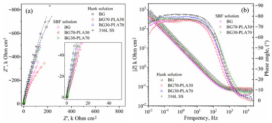 The physical barrier had a high effect on the current density, increasing the time for species diffusion through the scale thickness, retarding the activation mechanism at the metallic interface [29,30]. The phase angle Bode plots show a zone within a wide range of frequencies (from 500 0.5 Hz, approximately) with phase angle values above to 70°, which according to the Rp results described above correspond to the capacitive and resistive behaviour. This could be of interest in biomedical applications as a scaffold in tissue engineering, allowing the controlled transport of mass through the porous microstructure. Similar to the observed LPR results, the BG coating in the SBF solution and the BG70-PLA30 showed lower initial impedance values (Figure 17a). At 24 h of immersion, the total impedance had increased to values within the same order of magnitude as the other coatings, as shown in Figure 18b.